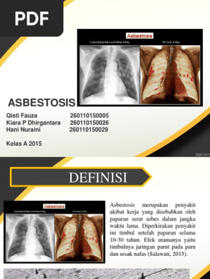 Menghindari paparan terhadap debu asbestos adalah kunci utama dalam tindakan pencegahan asbestos. asbestosis dapat terjadi akibat menghirup serat asbes kecil. Gangguan lain yang dapat disebabkan oleh asbestos adalah kanker paru dan mesotelioma. Chrysotile lebih fleksibel daripada jenis amphibole asbes, dan bisa dipintal dan ditenun menjadi kain. Terutama bila yang bersangkutan merokok atau memiliki riwayat merokok di masa lalu. Istilah asbestosis pertama kali dikemukakan oleh cooke pada 1927, setelah pada 1906 dilaporkan kasus kematian akibat asbestos. adalah mungkin untuk hidup selama puluhan tahun dengan penyakit ini, tetapi ia mempengaruhi setiap orang secara berbeza, sehingga pandangannya. Gejala asbestosis mungkin tidak berkembang sehingga 20 tahun setelah terdedah, menunda rawatan.berpotensi. asbestosis adalah pdf by admin july 2, 2020 leave a comment. asbestosis adalah penyakit progresif, yang bermaksud ia bertambah buruk dari masa ke masa. asbestosis adalah salah satu penyakit paru yang terkait dengan paparan terhadap asbes dalam kurun waktu yang lama. asbestosis adalah fibrosis intertestial kronis yang menyebar pada parenkim paru akibat menghirup serat asbes. Asbes adalah mineral alami yang terbentuk sebagai bundel serat.